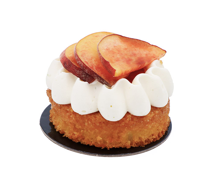 SUNSET : Biscuit cake, gélifié de pêches et framboises, ganache montée à la verveine, pêches fraîches