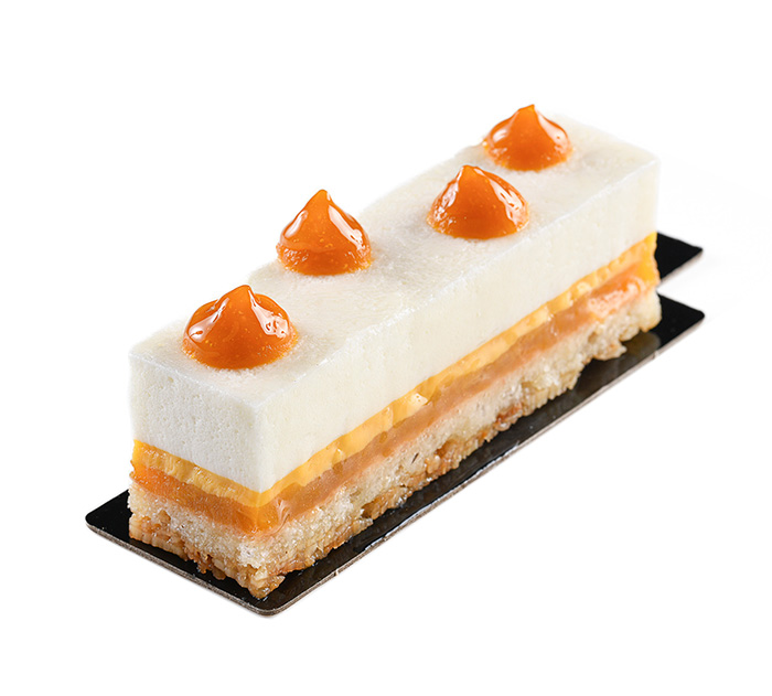 EXOTIQUE : Mousse légère à la noix de coco, compotée de mangue-ananas-passion, crémeux au fruit de la passion, dacquoise coco, croustillant aux amandes – SANS GLUTEN